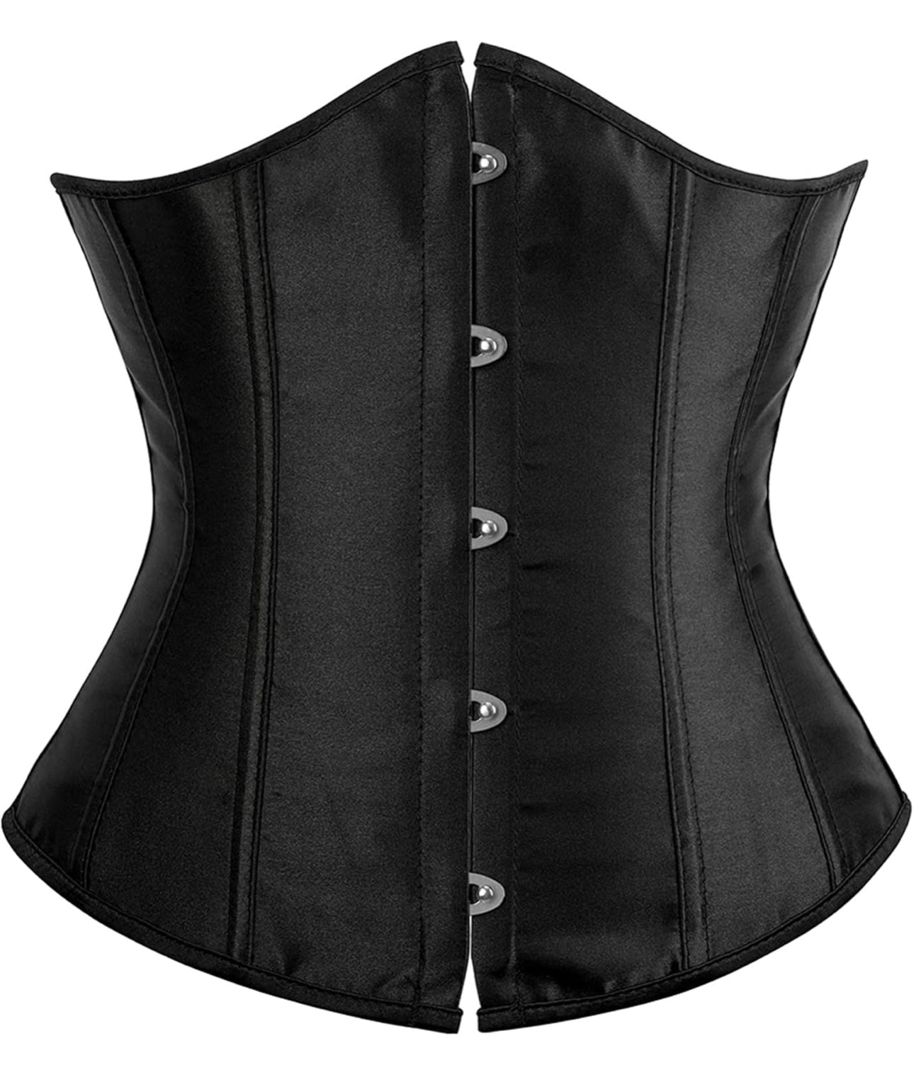 The corset is designed with structured boning and strategic tailoring to cinch the waist and accentuate curves.
